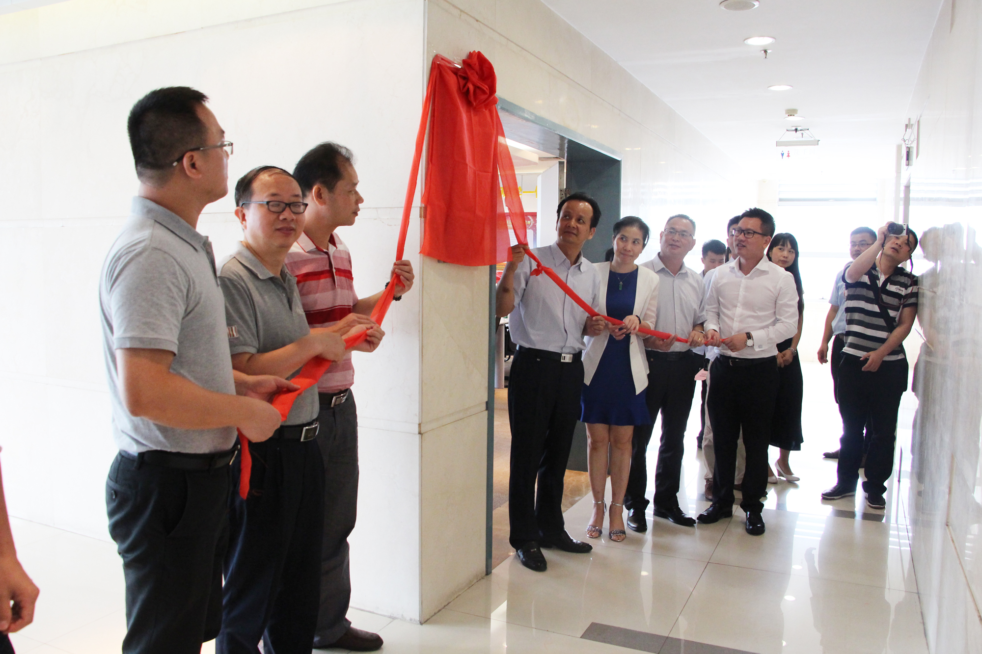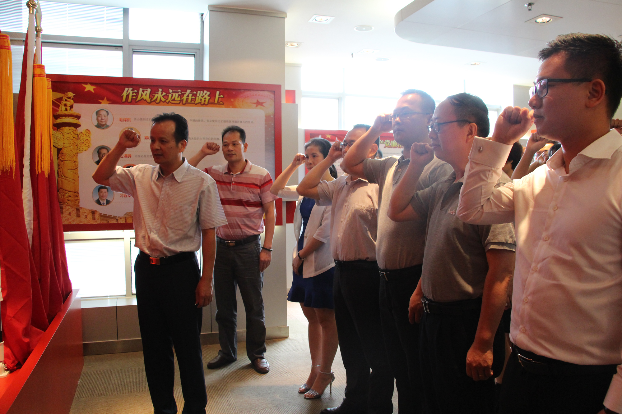 在全體黨員的見證下,黃主任與集團黨委領導共同為黨建活動室揭牌并合影留念。