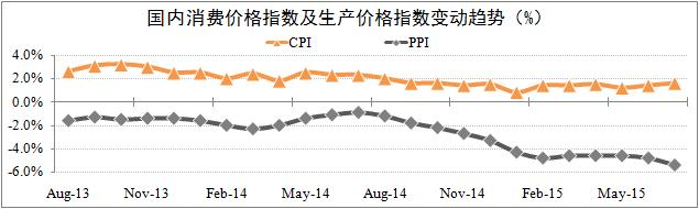 通貨緊縮預(yù)期增強。截至7月份,國內(nèi)價格總水平運行依然偏弱,以消費價格指數(shù)(CPI)和生產(chǎn)價格指數(shù)(PPI)為主的經(jīng)濟面出現(xiàn)“剪刀差”現(xiàn)象。數(shù)據(jù)顯示,7月份CPI環(huán)比上漲0.3%,同比上漲1.6%;PPI環(huán)比下降0.7%,同比下降5.4%。其中PPI已連續(xù)41個月出現(xiàn)負增長,且幅度逐月擴大。CPI與PPI增幅差距的進一步擴大強化了國內(nèi)通貨緊縮預(yù)期,宏觀經(jīng)濟增長風(fēng)險加大。