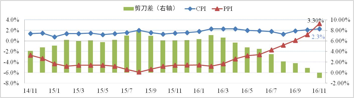 據國家統計局數據顯示,11月份CPI指數同比上漲2.3%,環比上升0.2個百分點;PPI指數創5年來新高同比上漲3.3%,環比上升2.1個百分點。雖然CPI、PPI同步上漲,但PPI的漲幅明顯高于CPI,說明物價上漲主要集中在上游原材料行業,而中下游行業由于終端需求疲軟被迫承受來自上游成本壓力。
