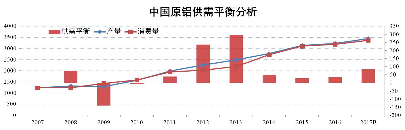 國內原鋁供需方面:2017年,預計新增需求量在150萬噸左右,總需求量在3367萬噸左右;新增供給量在195萬噸左右,總供給量在3450萬噸左右,整體來看,2017年國內原鋁供需方面在過剩約80萬噸。