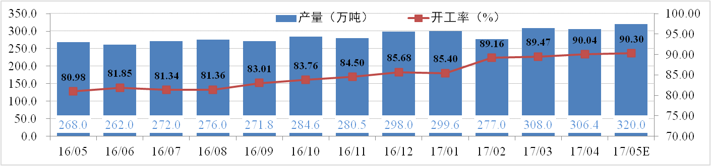 分析認為:供給側改革政策已經落地,短期內仍難以改變供需格局,因此市場供應仍將保持在高位。預期5月產量320萬噸,日化產量10.32萬噸,供應持續增加。