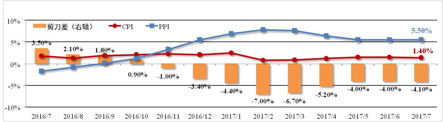 7月份全國居民消費(fèi)價(jià)格指數(shù)(CPI)為1.4%,較上月縮小0.1個(gè)百分點(diǎn),主 要原因在于水果大量上市致使鮮果價(jià)格下降以及豬肉價(jià)格疲軟。生產(chǎn)價(jià)格指數(shù)(PPI)為5.5%,連續(xù)三個(gè)月持平。剪刀差較上月擴(kuò)大0.1個(gè)百分點(diǎn)至-4.1%。