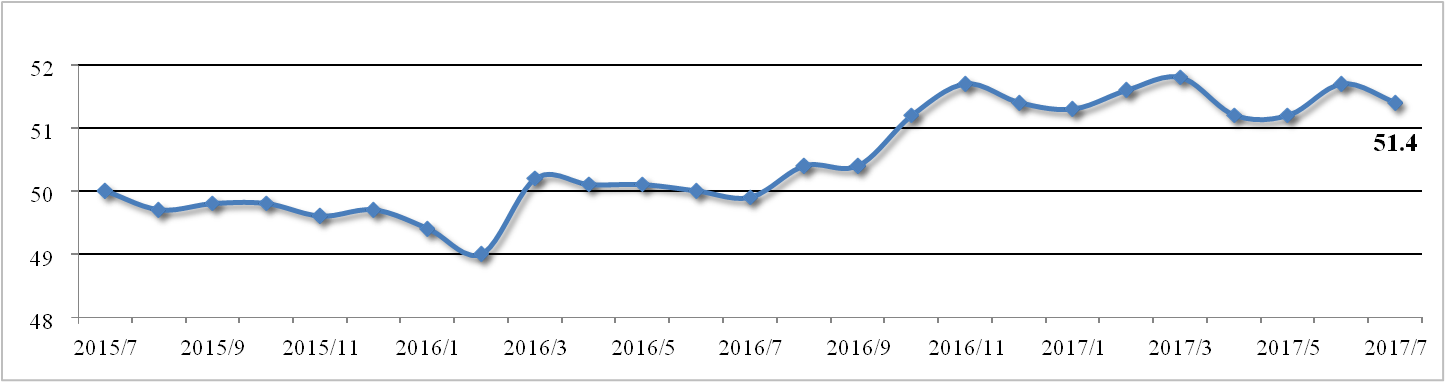 7月官方制造業(yè)PMI為51.4%,略低于預(yù)期,較上月回落0.3個(gè)百分點(diǎn),依然 位于景氣區(qū)間。生產(chǎn)指數(shù)與新訂單指數(shù)差值大幅縮小至0.7個(gè)百分點(diǎn),反映制造 業(yè)供求關(guān)系有所改善,對商品價(jià)格形成支撐。