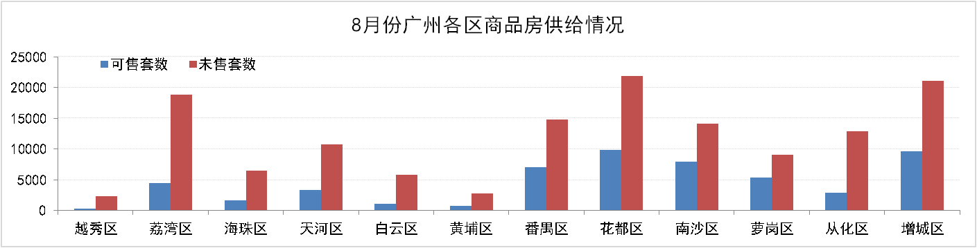 8月31日,廣州市新建住宅商品房共194,949套,環比上升3.1%,其中:可售住宅商品房為54,104套,占比27.75%;未售住宅商品房140,845套,占比72.25%。花都、增城、番禺、南沙庫存量較高,可售和未售房源累計占全市比例分別為63.73%和51.13% 。