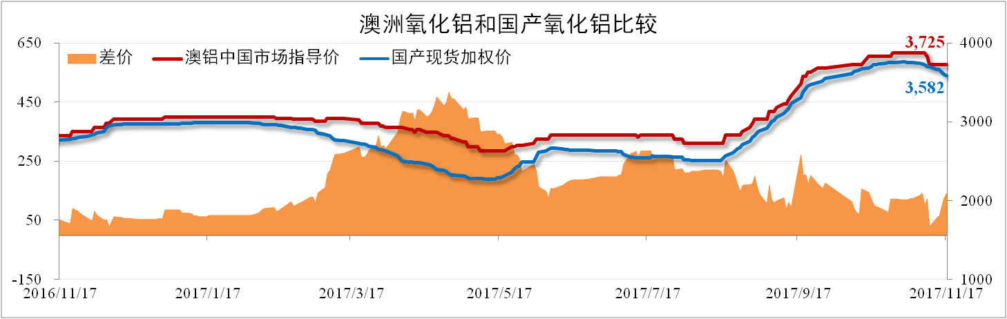 10月份,國(guó)產(chǎn)氧化鋁價(jià)格上漲幅度過(guò)大,進(jìn)口氧化鋁價(jià)格繼續(xù)緩慢跟漲。截止11月17日,澳洲氧化鋁中國(guó)市場(chǎng)指導(dǎo)價(jià)為3,725元/噸,環(huán)比下降2.61%,國(guó)內(nèi)氧化鋁加權(quán)價(jià)格3,582元/噸,環(huán)比下降3.20%,價(jià)差達(dá)到143元/噸。