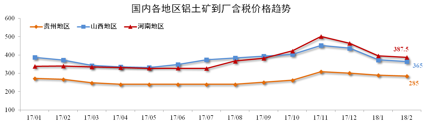 2月份各地鋁土礦價格保持下調。截止2018年2月,貴州(AL:60%,A/S:5.5-6)到廠含稅價月均價285元/噸,環(huán)比下降2.06%;山西鋁土礦365元/噸,環(huán)比下降2.38%;河南鋁土礦387.5元/噸,環(huán)比下降2.07%。