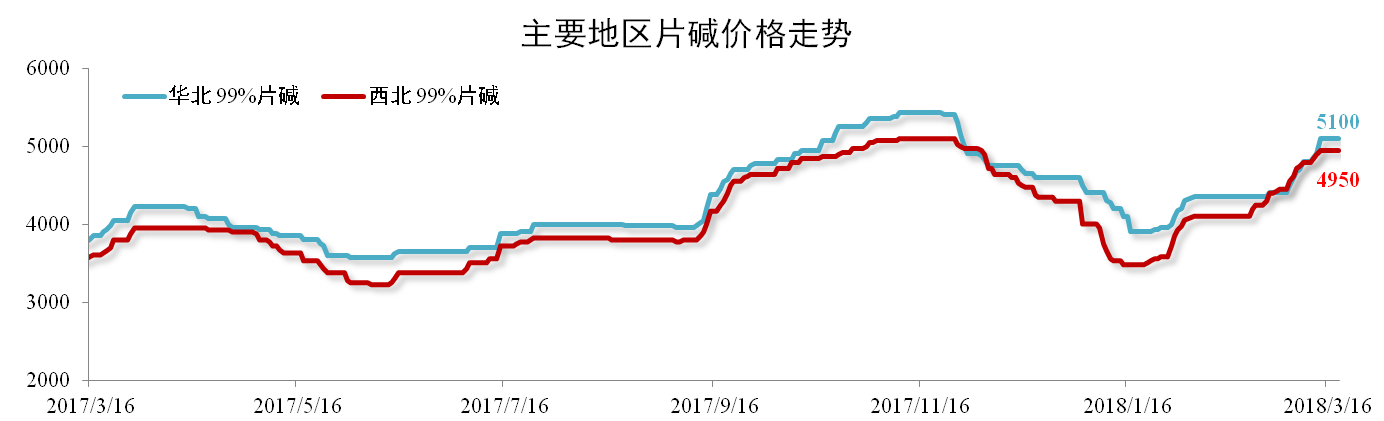 臨近采暖季限產(chǎn)復工時點,下游企業(yè)備貨需求旺盛,2月下旬至今片堿價格大幅上漲。截止2018年3月19日,華北99%片堿價格報5100元/噸,環(huán)比上漲17.24%,西北99%片堿價格報4950元/噸,環(huán)比上漲20.73%。
