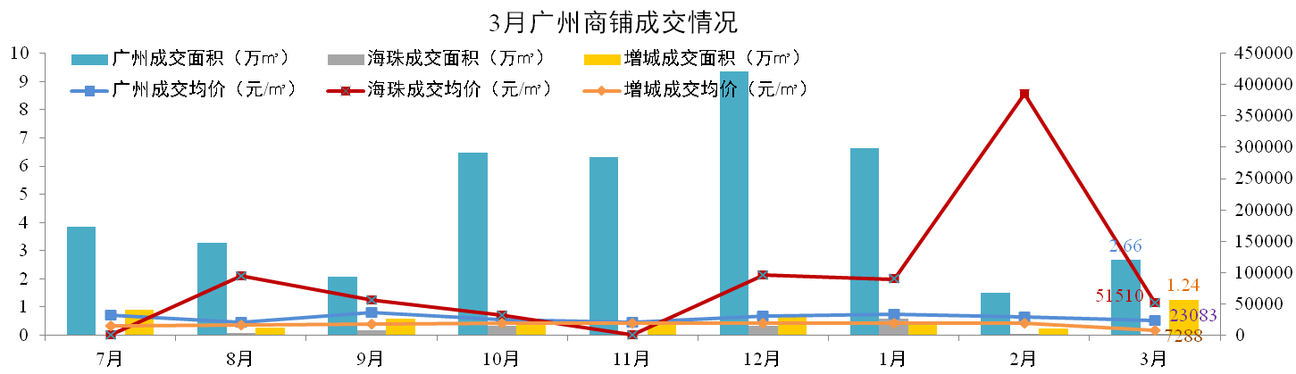 3月廣州一手商鋪成交2.66萬㎡,環比增加88%。海珠區成交0.01萬㎡,增城市場成交1.24萬平米,環比上升474%。全市成交均價23,083元/㎡,環比下降18%,海珠區均價51,510元/㎡,增城區均價7,288元/㎡。