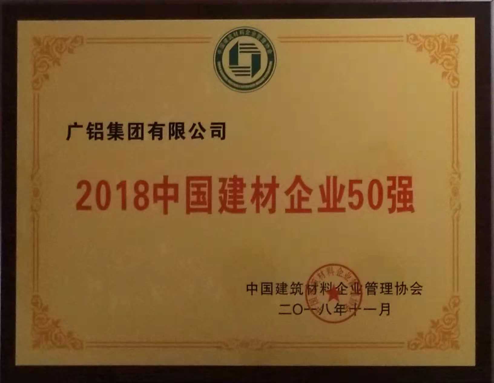 廣鋁榮獲“2018中國建材企業50強”、“2018中國民營建材企業20強”、“2018中國建筑鋁型材10強”稱號