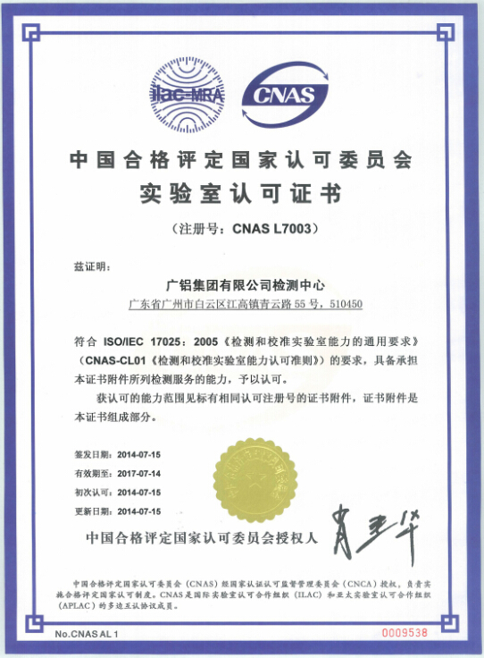 Post time:2014-07-24Complying with the requirements of ISO / IEC 17025:2005 General Requirements for the Competence of Testing and Calibration Laboratories (i.e. CNAS-CL01 Accreditation Criteria for the Competence of Testing and Calibration laboratories), Galuminium Group Co., Ltd. Testing Center passed CNAS' accreditation officially on July 15, 2014 (while the certificate was obtained on July 22) and is qualified for testing services listed in the appendix of the certificate. The Testing Center of the Company can use CNAS National Laboratory Accreditation Mark within the scope of certification and accreditation, and at the same time, it will be inscribed on the directory of certification and accreditation institutions approved by CNAS. The Testing Center will obtain registration, release information and accept supervision and audit of certification and accreditation institution on the CNAS official website, which will significantly improve the Company's visibility, enhance its market competitiveness among other peers in the industry and lay a solid foundation for its long-term development.